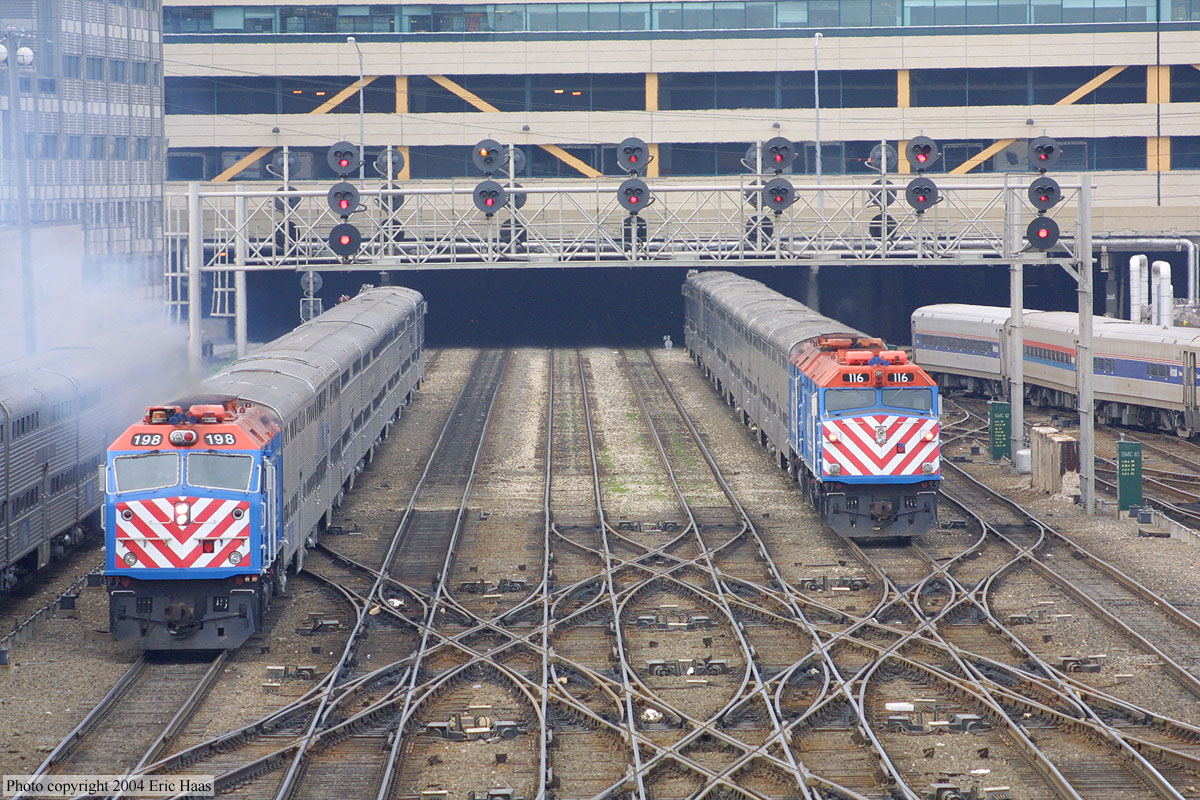 Trains enter and leave LaSalle Street Station.